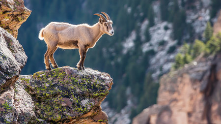 A goat stands on the rock on the mountain