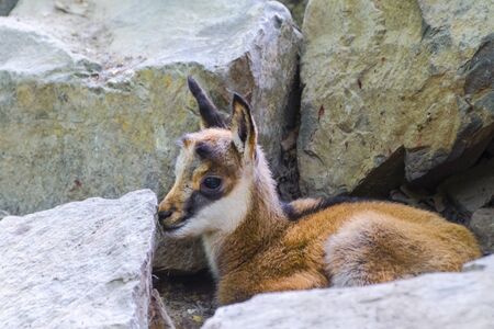 Baby Alpine chamois on a rocky hill