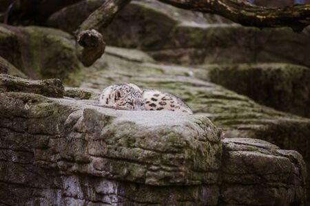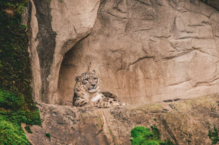 The adult snow leopard lies on a large rock and looks attentively and alert at the Basel Zoo in Switzerland. Cloudy weather in winter.