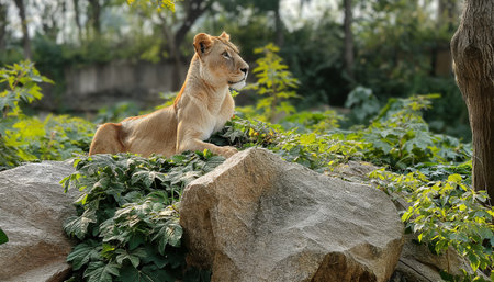 Lioness sitting on a rock in a zoo. Lioness is a carnivorous mammal.