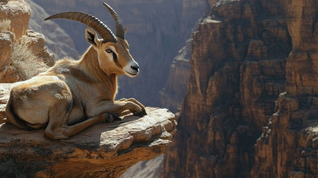A Nubian ibex resting on a rocky ledge overlooking a deep canyon under a harsh midday sun.