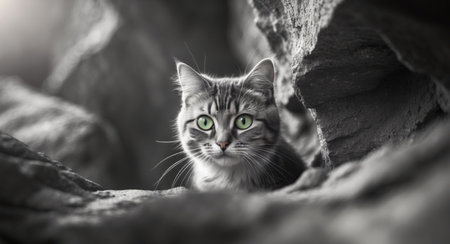 AI Generated. Adorable Cat with Bright Green Eyes Peeking from Rock Crevice