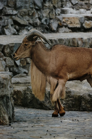 A Barbary sheep with long beard and curved horns walking near rocks at Belgrade Zoo. Side view portrait
