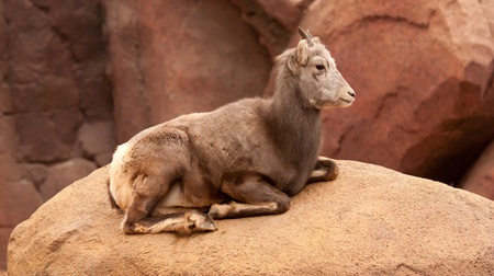 Brown mountain goat lying on the rocks