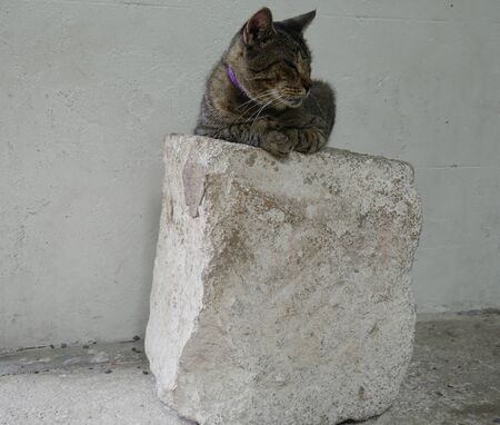 Wide shot of one of the famous cats relaxing on a big rock at the Hemingway house in Key West, Florida.