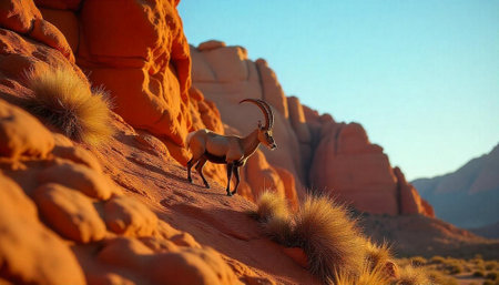 Ibex walks among desert rocks under clear blue skies