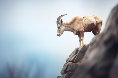 Majestic ibex climbing rugged mountain terrain, showcasing powerful horns and graceful movement against rocky backdrop in natural habitat