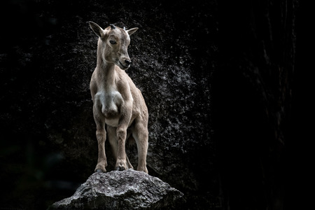 little Mountain horn Sheep on a cliffs edge in the mountains on black