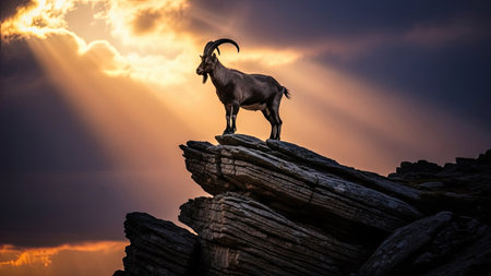 A mountain goat stands atop a rocky peak, silhouetted against a vibrant sunset. The image displays dramatic lighting and textures, featuring warm colors in the sky and cool tones on the rocks. It could be used for various projects needing a strong visual narrative or evocative imagery.