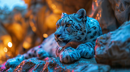 An AI-generated illustration of a majestic snow leopard resting on a rocky surface