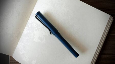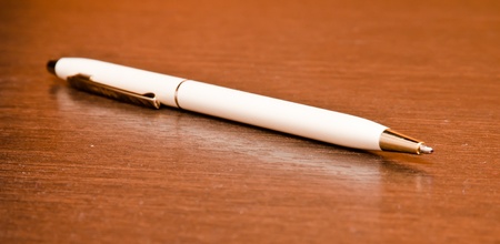 The pen white lies on a wooden table