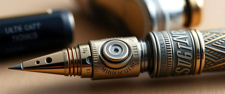 An extreme close-up, macro shot of an exquisitely engraved gold fountain pen nib gleaming under a warm light. The intricate details and sparkling reflection highlight the luxury, craftsmanship, and elegance of fine writing instruments.