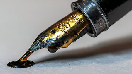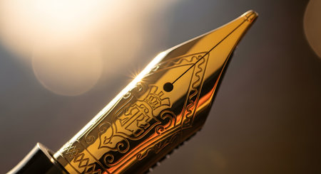 Fountain pen nib writing in golden hour light. Extreme macro of wet ink sheen and metal engraving.