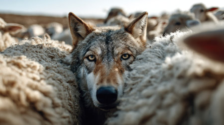 A captivating close-up image of a wolf peering out from a flock of sheep, showcasing the tension between predator and prey in a natural setting.