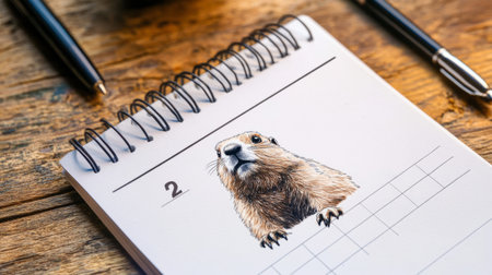 Red-haired home Syrian hamster stands on an open notebook on a table