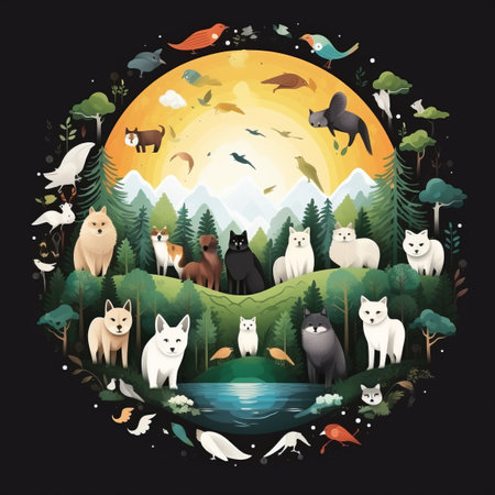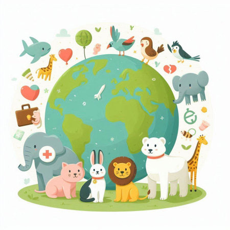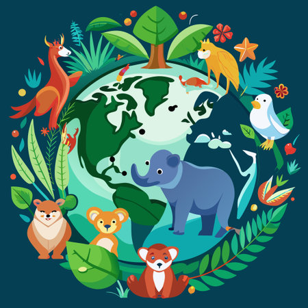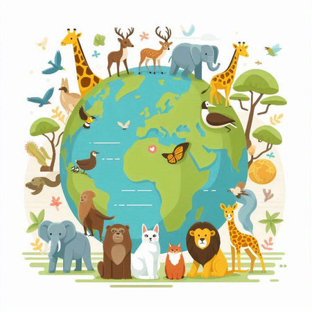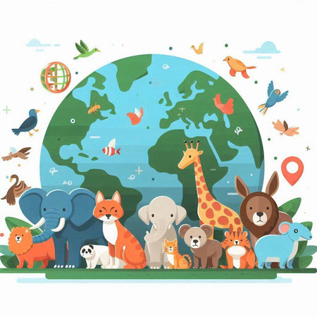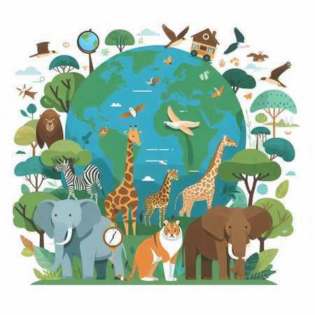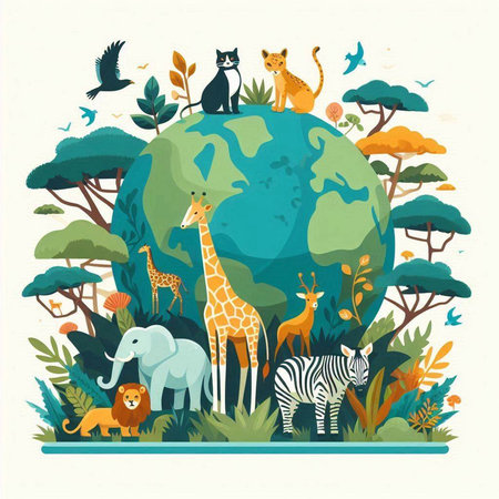 Colorful eco friendly illustration of the Earth surrounded by animals, showcasing wildlife and environmental awareness in a vibrant green palette