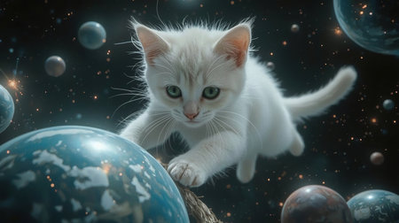 Fluffy kitten explores a cosmic landscape filled with colorful planets and stars in a whimsical journey through space