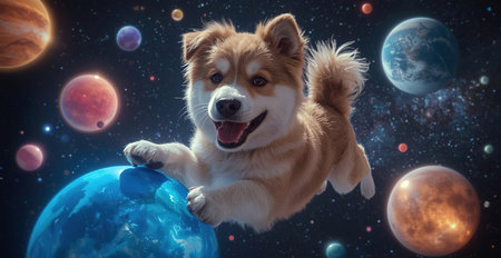 A joyful dog plays among vibrant planets in a cosmic setting, surrounded by stunning colors and a starry background, evoking a sense of wonder and imagination