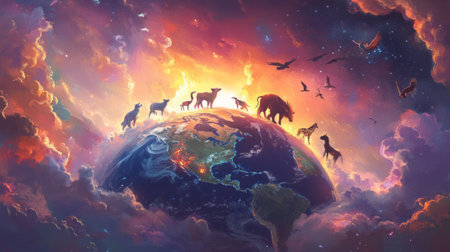 Vibrant animals on earth surrounded by colorful sky and clouds at sunset.