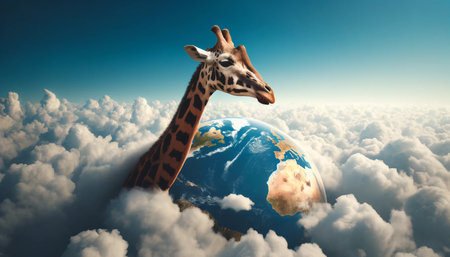 A figurative image of a giraffe standing on the Earth, stretching its neck above the clouds and looking at the horizon. The clouds are soft and wavy, contrasting with the detailed texture of the giraffe's fur.