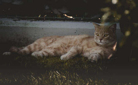 Loovely ginger cat relaxed in the sunny garden with sun rays. Relaxing pet portrait.