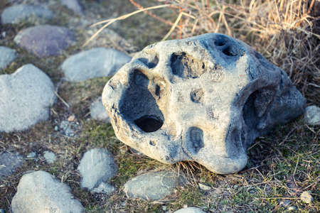 Stone rock fragment on the bank of a mountain river. Natural photo.