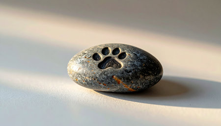 A single smooth stone rests in the soft light, bearing the indelible mark of a beloved pets paw. This simple yet powerful object serves as a lasting tribute, symbolizing eternal friendship, cherished memories, and the quiet grief of saying goodbye.