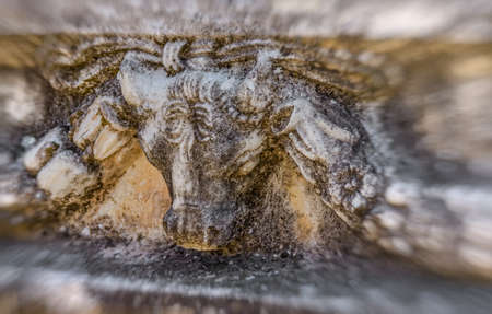 Building relief detail with animal head of architectural frieze in Aphrodisias (Turkey) build during Roman period.