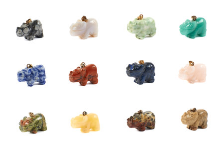 Rhinoceros rhino sculpture made of carver semiprecious stones isolated over white background, set of fourteen different stones