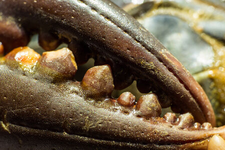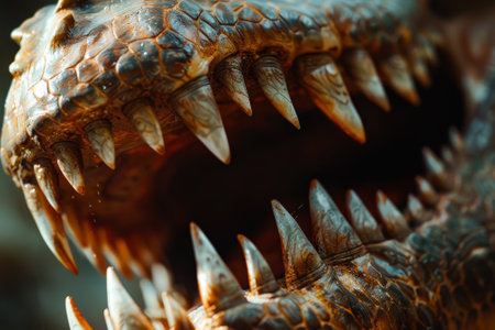 A close up of a dinosaur's mouth with sharp teeth. The teeth are brown and appear to be worn down. Concept of danger and power, as the teeth are sharp and menacing