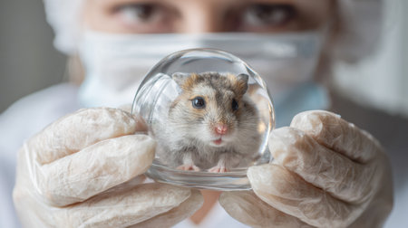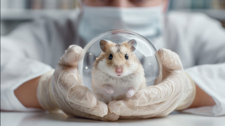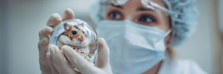 A vet in a protective mask carefully examines a hamster inside a transparent ball, ensuring the pets health and safety in a clean clinic environment.