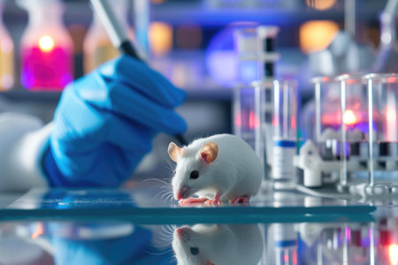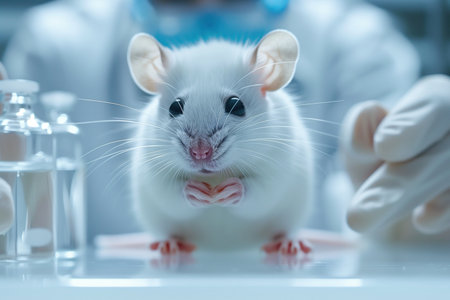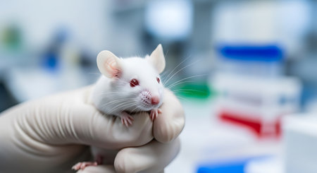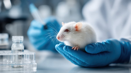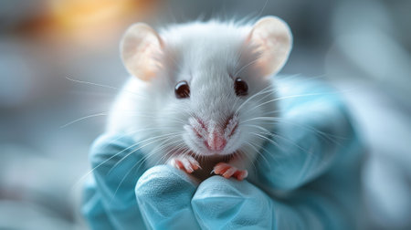 A white laboratory mouse is held in the hand of a scientist wearing gloves, surrounded by various research equipment in a modern laboratory.