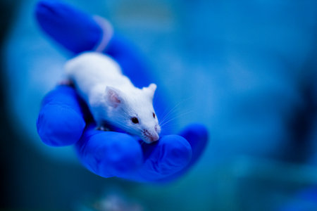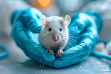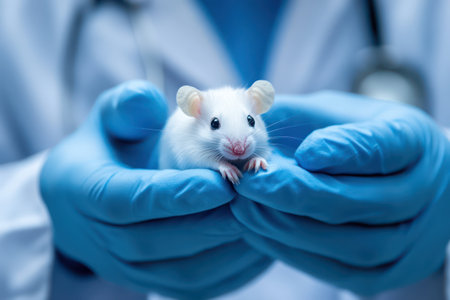 Researcher gently handles a lab mouse while wearing protective blue gloves in a sterile research environment, symbolizing precision and care.
