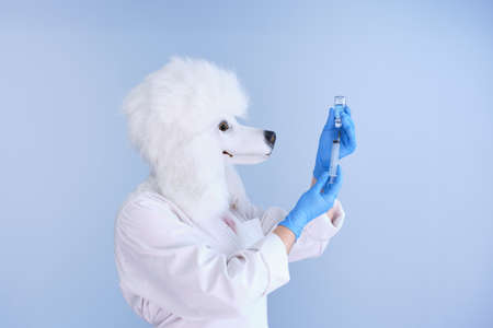Young woman in a latex dog head mask and white coat preparing for a vaccination on a blue background. Doctor medical veterinary concepts.