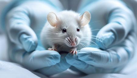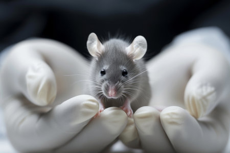 A lab mouse held in gloved hands under soft natural light, closeup shot emphasizing care