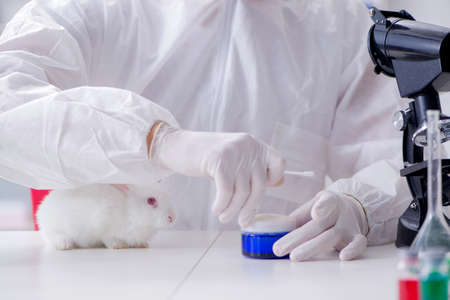Scientist doing animal experiment in lab with rabbit