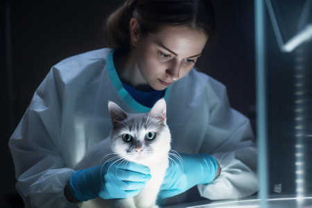Veterinarian, female animal doctor checking at a white cat at vet clinic, AI generative image.
