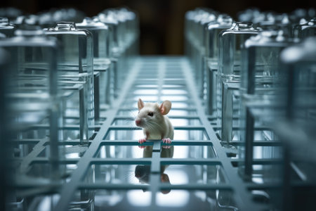 A toy mouse stands in a room filled with glass shelves, creating an intriguing visual contrast, lab rat in a transparent maze for testing, AI Generated