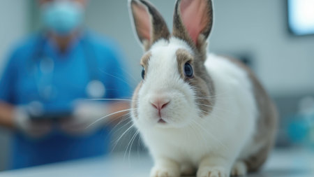 rabbit with alert expression sits in veterinary clinic. Blurred medical professional in blue uniform in background