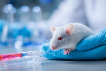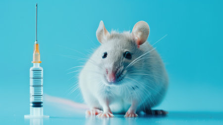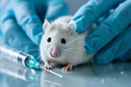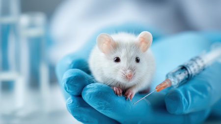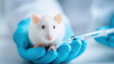 A laboratory mouse is held in a gloved hand while receiving an injection with a syringe. This scene emphasizes scientific research and ethical treatment in medical experimentation.