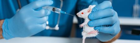 cropped view of veterinarian in latex gloves holding white mouse and syringe with medicine, panoramic shot