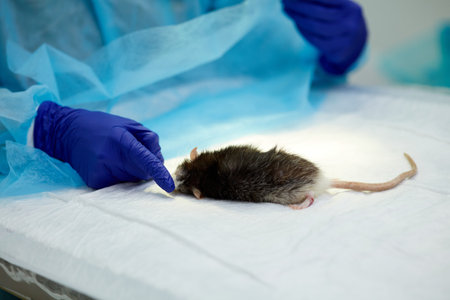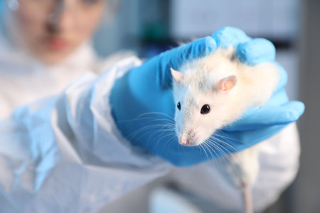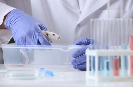 Scientist working with rat in laboratory, closeup