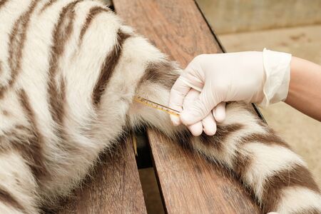 The vet is checking the tiger's health by steps.