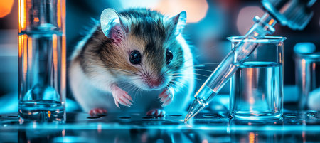 Tiny Lab Assistant Adorable Hamster Among Scientific Glassware and Pipette in Blue and Orange Tones
