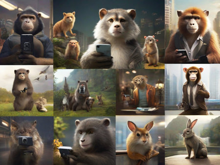 Surreal and imaginative digital depicting animals with human like fashion and expressions The creatures are dressed in various costumes masks and accessories