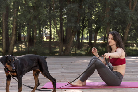 Young beautiful woman doing yoga poses in the park with doberman dog. Doberman dog is happy to play sports together with the owner