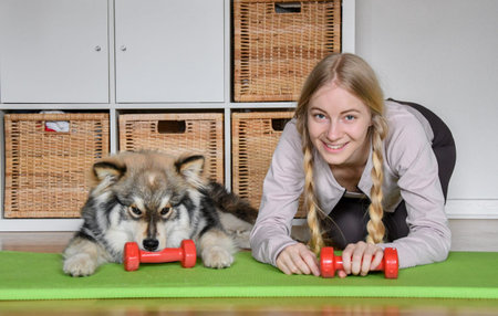 Blonde woman or girl working out at home in her apartment with her Finnish Lapphund dog