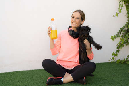 Sport with a dog. Attractive girl working out on the blue fitness mat with her dog. Athletic woman doing exercise. Strength and motivation, sport and healthy lifestyle. Female fitness.