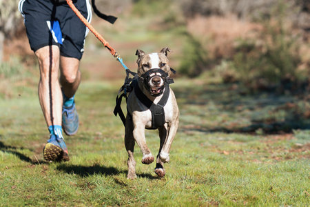 Canicross dog mushing race. Pointer sled dog attached to runner. Autumn competition.