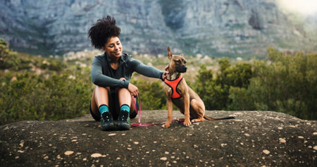 Smile, woman and hiking with dog on mountain for travel, morning exercise and trekking break. Happy, female person and relax with pet companion, tourism adventure and fresh air for vacation bonding